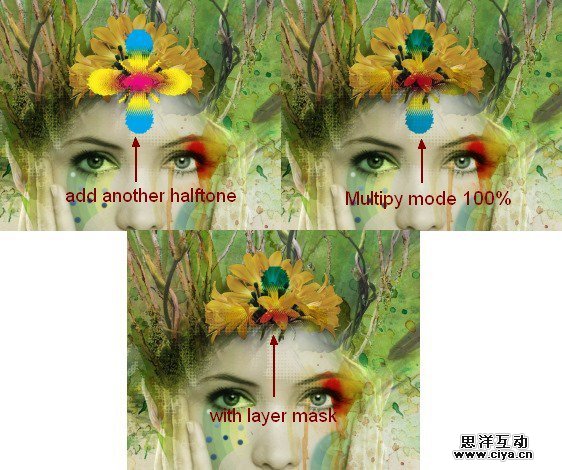 选择一个五颜六色的半色调图片,将之放在花的中间,混合模式设置为 正片叠底 100%,去掉其下半部分,也是利用图层蒙版实现这一效果。