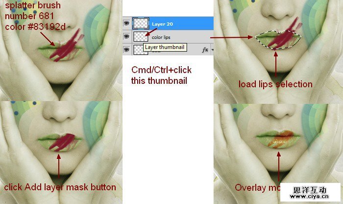 新建一个图层,将画笔设置为飞溅笔刷,将前景色设为#83192d。选择100像素大小的第681号笔刷,在嘴唇上画一笔。单击图层彩唇时,按住Cmd/Ctrl,加载出图层选区,然后单击添加图层蒙版按钮,之后,将混合模式设置为 叠加 100%: