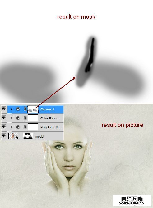 然后使用不透明度为100%和20-30%的柔软黑色笔刷在曲线图层蒙版上进行涂抹。下图就是我涂抹的笔迹和在图片上的效果:
