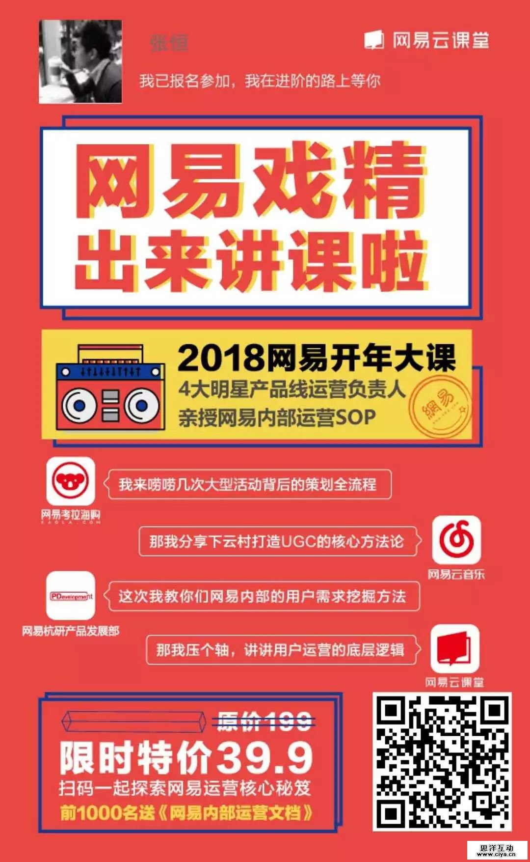 第二,海报中最大的字体不是课程名称,而是“网易戏精”,有没有注意到?显然,主办方很清楚这次课程到底卖的是什么,要的就是网易的势能。谁来讲,比讲什么更重要。