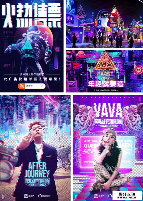 从天猫造物节到中国有嘻哈的海报,我们不难看出赛博故障风在设计领域的影响。赛博朋克张扬的调性,符合现在年轻人标榜自我的价值观。而故障艺术这种刻意展现文件损坏状态的视觉效果,令画面更加具有科技发展中的不确定和未知感。