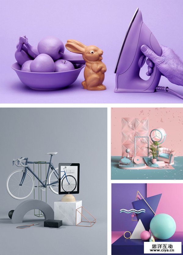 随着C4D的流行,三维的表现形式在设计中变得愈演愈烈。不过在后扁平化时代,如何在扁平与立体的形式中间寻找平衡是大家关注的焦点,而三维纯色渲染恰恰是一种很好的尝试。空间感的布局拓展了画面深度,同时物体纯色系的渲染方式又强化了画面的平面感。设计将干扰人们注意力的因素排除,只留下需要传达的主题部分,令人印象深刻,这样的形式已经在摄影及三维艺术中流行起来,充满仪式感的画面让设计者爱不释手。