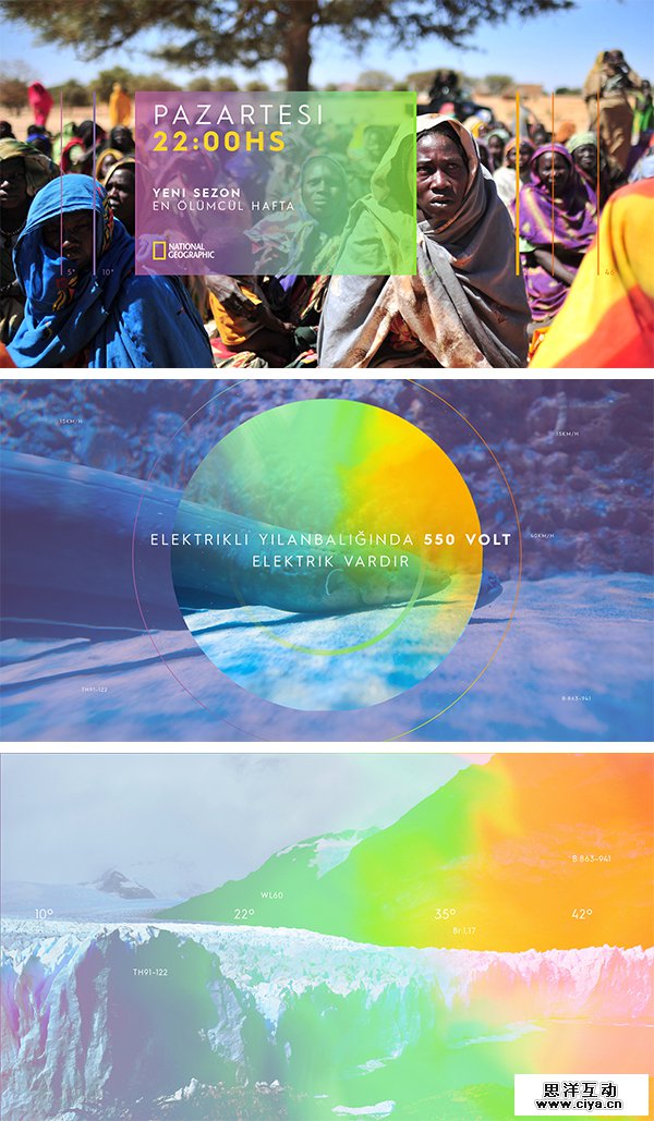 光感透气叠加的方式让颜色与其背后的内容更和谐地相融在一起。在《国家地理》这组关于气候变暖宣传设计中,由于光感叠加令颜色渐变产生氤氲之感,直观的传达给读者气候变化的感受。