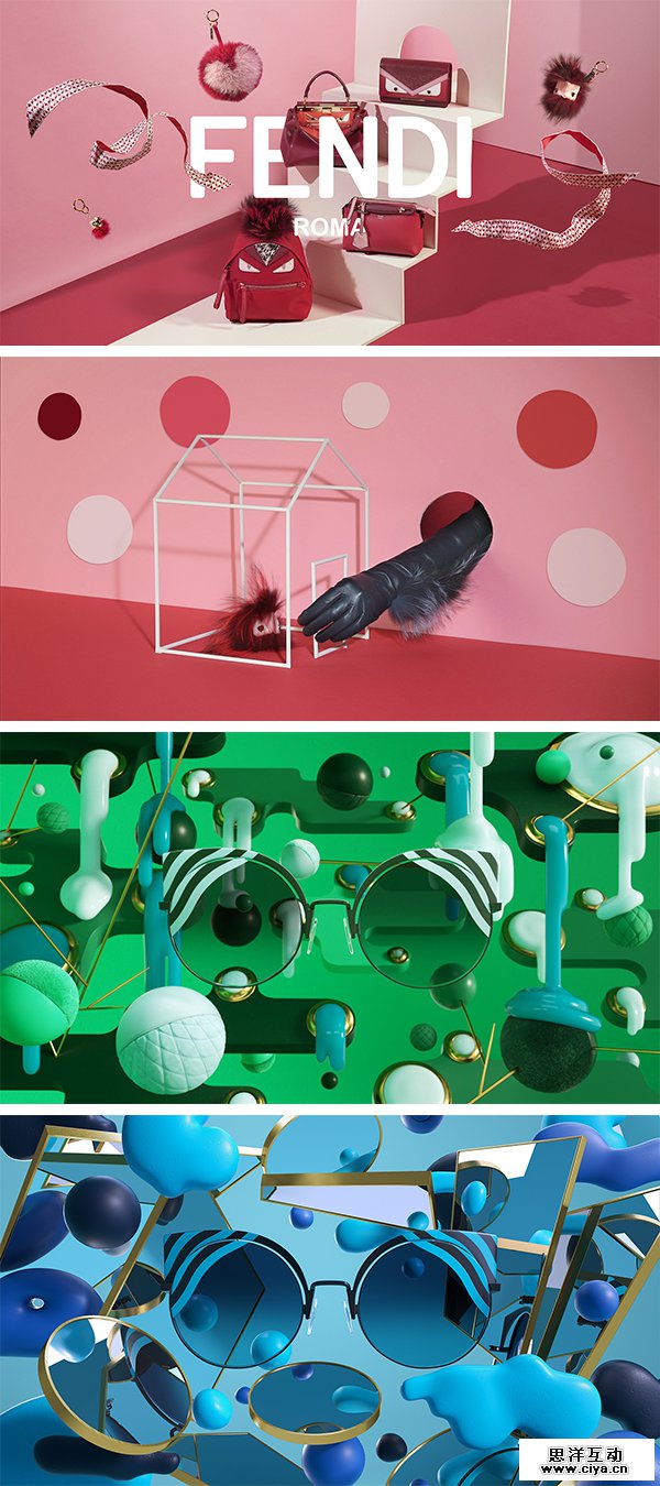三维纯色渲染在时尚设计、产品设计领域中应用广泛。FENDI的2017情人节系列广告通过红色系的产品组合,很直观的体现热烈的节日氛围。而HypnoShine系列太阳眼镜广告中,利用统一绿色系的元素的搭配,强调了「超防晒丛林主题」,将产品本身无法表达的时尚感通过环境的组合放大强化。