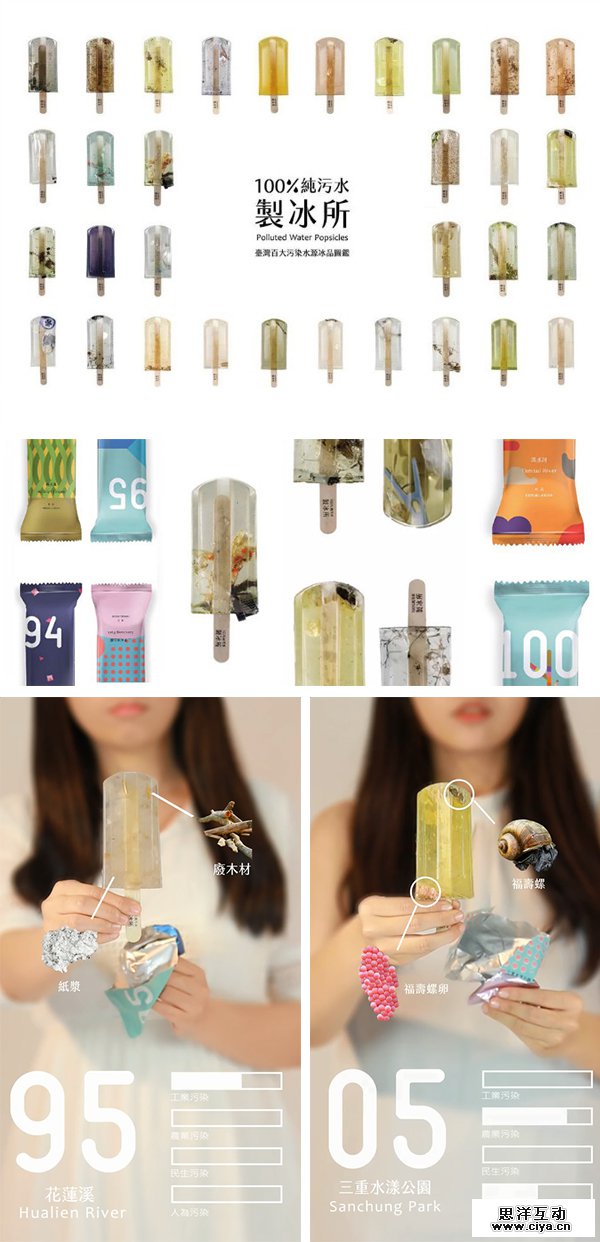解构的手段融入了设计冲突感,会让观者产生耳目一新的体验。而解构下的物体本身带有的符号属性,又令设计真实而显得有据可循。台湾艺术大学学生用污水制作冰棒,打破了人们对冰棒美味可食用的固有印象,经验与现实的强烈反差,直观的引发人们对水污染问题的思考。