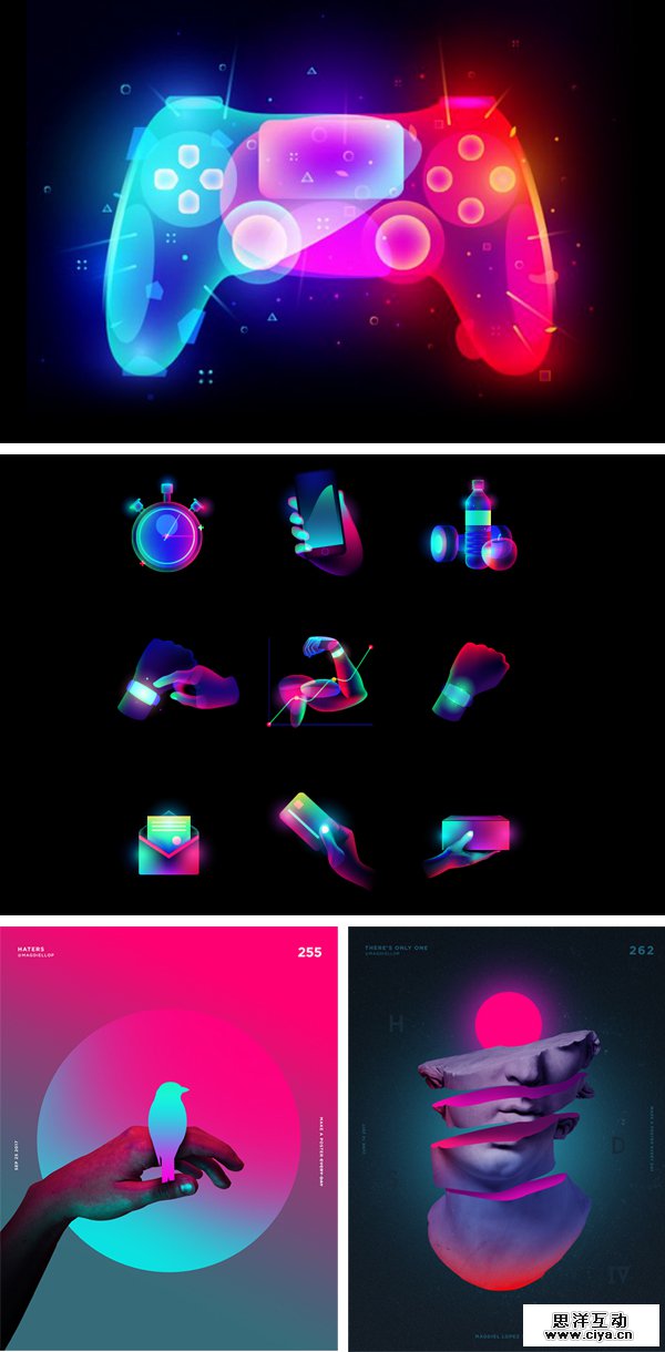 去年我们曾经总结过半透明叠加这种形式。今年我们发现这样的叠加方式开始融入新的视觉元素——光感。 光因为其剔透,纯净,反射的特性,一直被人们所青睐着。 人们不再满足于简单的色彩叠加,增加光感的设计将会为产品增添更多的未来迷幻属性。