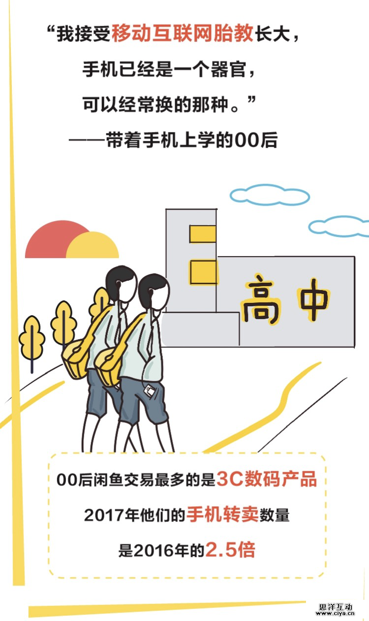 中国青少年研究中心调查显示, 2016 年 00 后的手机拥有率为64.6%,十年间增长了56. 6 个百分点。无独有偶, 2017 年 00 后闲鱼交易最多的是3C数码产品,其中 00 后的手机转卖量较 2016 年增长了155%。接受着“移动互联网胎教”长大的一代 00 后,手机已经成为他们与生俱来的“人体器官”。