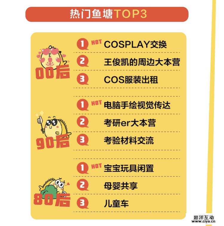 与80、 90 后画风迥异的是, 00 后关注最多的鱼塘则是“cosplay交换”、“王俊凯的周边大本营”和“cos服装出租”。没有 90 后的就业压力,也无需像 80 后一样把精力投射在育儿问题上, 00 后把热情都投注到了二次元和追星领域。不知道这种无忧无虑的状态,是否会让 8090 后心生羡慕。