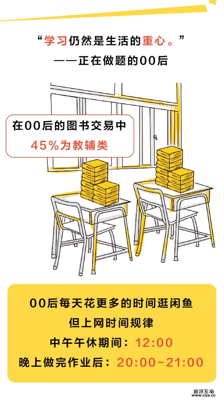 虽说 00 后相对前卫,但处于学龄期的他们,学习还是生活的重心。数据显示, 00 后在闲鱼的图书交易中,45%为教辅类。根据中国青少年研究中心发布的《“ 00 后”发展状况研究》调查显示,超 7 成“ 00 后”作业超标,他们的课外班时间是“ 90 后”的 2 倍,过半“ 00 后”睡眠不足。尽管家庭经济条件较为丰裕, 00 后可以享受许多 8090 后少年时无法享受的物质条件,但是学业压力下的生活也并没有想象中那么轻松。