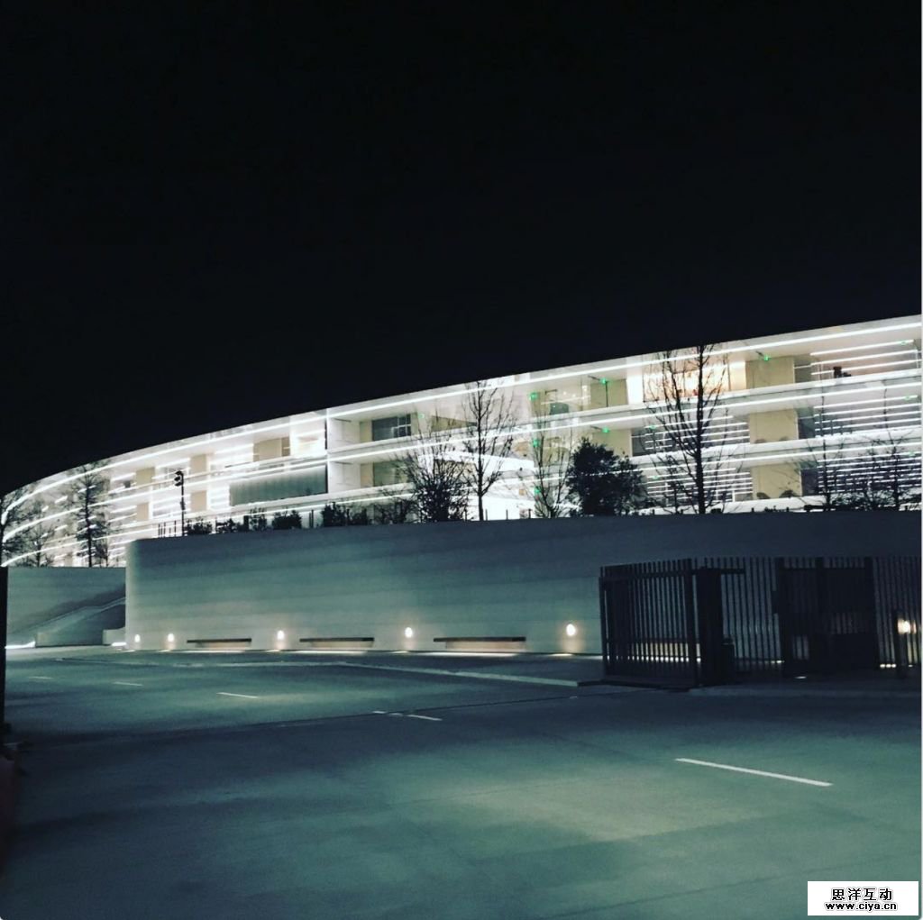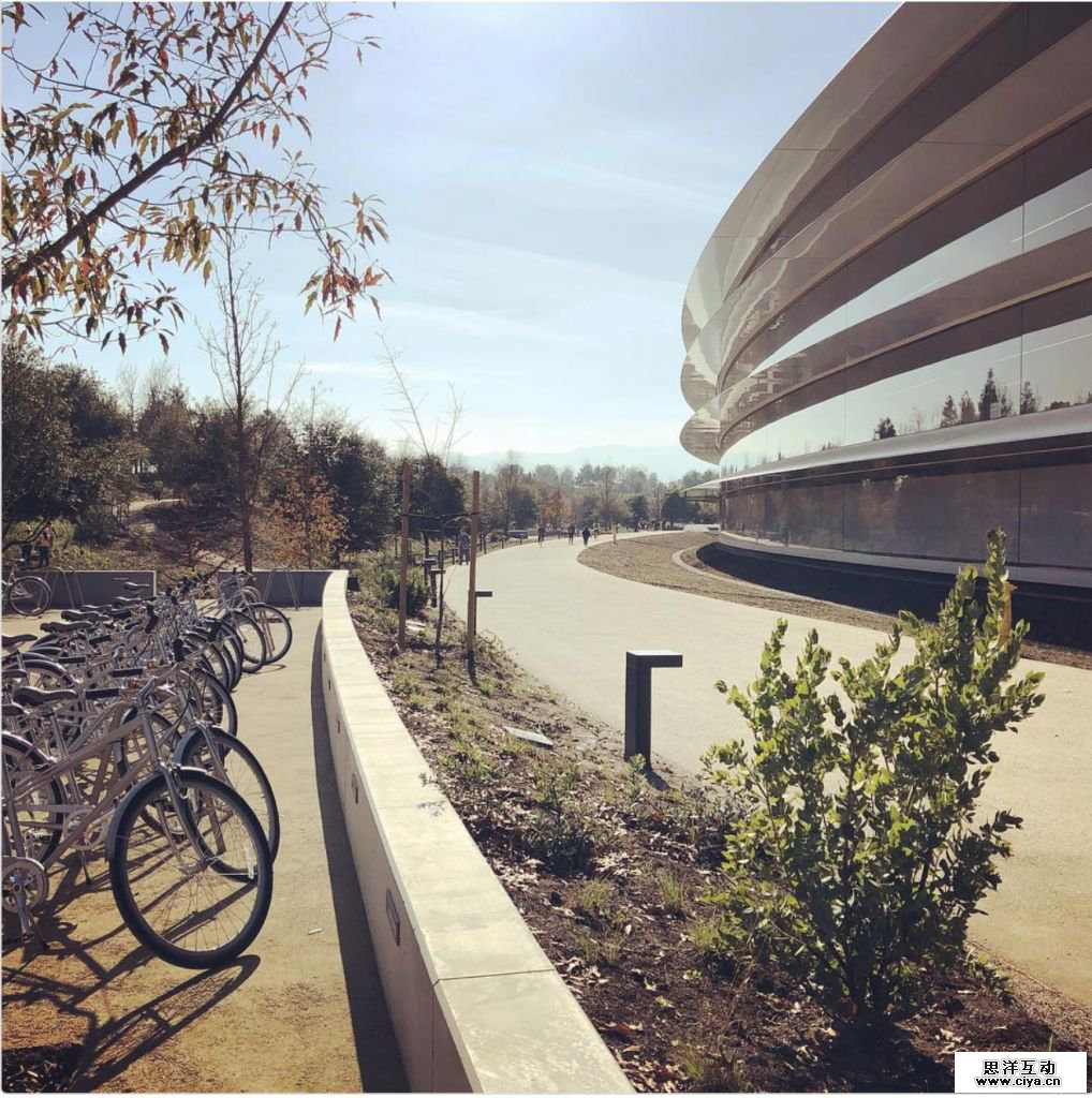 看看那些灰色的苹果自行车,停在那里便于人们四处走动。一些停车场离主楼有 10 分钟的步行路程。我现在在苹果公园上班,园区的楼梯还会在晚上亮起来。