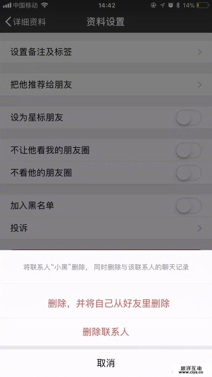 1、支持双向删除好友功能,在进行删除好友操作时,有“删除联系人”和“删除,并将自己从对方好友里删除”两个选项。这样一来,自己就不会出现在已经删除好友的列表中了。