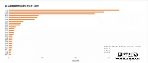 除此之外,我们也发现2018年区块链岗位数量在中西部的分布相对较少,西南和中东部地区有一定数量,如果有乌鲁木齐或者齐齐哈尔的兄弟想从事区块链相关的工作,不妨先来东部、东南部地区看一看。
