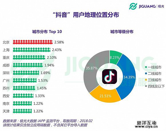抖音用户对具体城市并没有表现出显著的集中度,即便是在用户分布上占比最高的北京,所占的比例也仅为2.58%。尽管最初的定位更偏向于一二线城市的年轻用户,但随着用户规模逐步扩大,抖音向三线及以下城市的下沉也愈发显著。用户城市等级分布结果显示,分布在三线城市的抖音用户占比为21.51%,四线及以下城市更是达到35.87%。