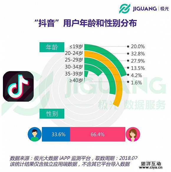 根据极光大数据的统计结果,抖音短视频中女性用户的占比要显著高于男性,达到66.4%。尽管用户体量日益壮大,年轻用户在抖音短视频中仍旧占据着较大的比重,19岁以下的用户占比为20%,24岁以下为52.8%。