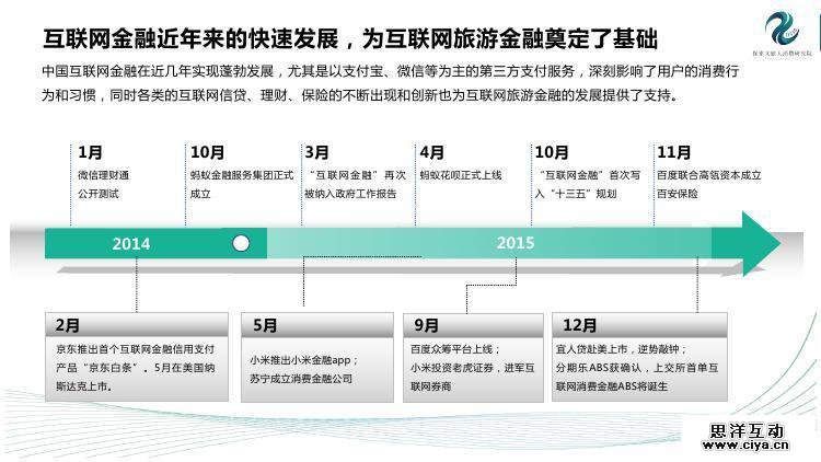 互联网金融近年来的快速发展,为互联网旅游金融奠定了基础。中国互联网金融在近几年实现蓬勃发展,尤其是以支付宝、微信等为主的第三方支付服务,深刻影响了用户的消费行为和习惯,同时各类的互联网信贷、理财、保险的不断出现和创新也为互联网旅游金融的发展提供了支持。