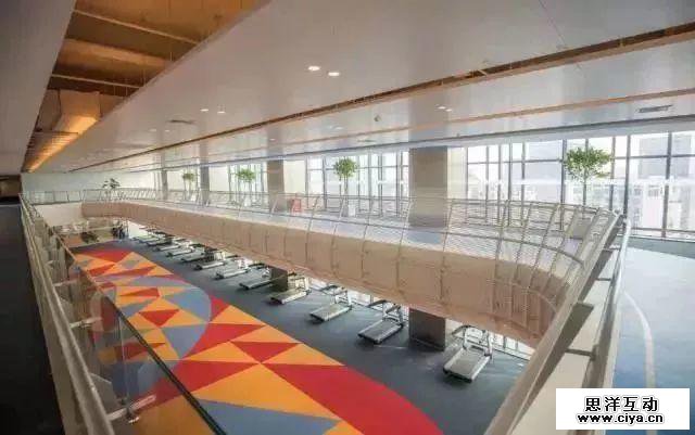 在100米高空,还有一条300米长的室内环形跑道贯穿两栋塔楼。员工要跑步,都不用走出公司了,特么还是在空中跑!