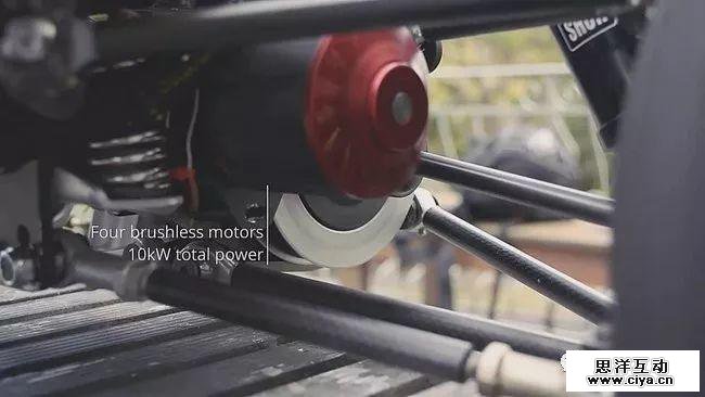 BajaBoard 的功率足够大,每个轮子由一台 3kW 的无刷电机驱动,总功率有 12kW,这个功率和一些小排量的摩托车已经不相上下了。在负重 100kg 下依然有着出色的爬坡能力。